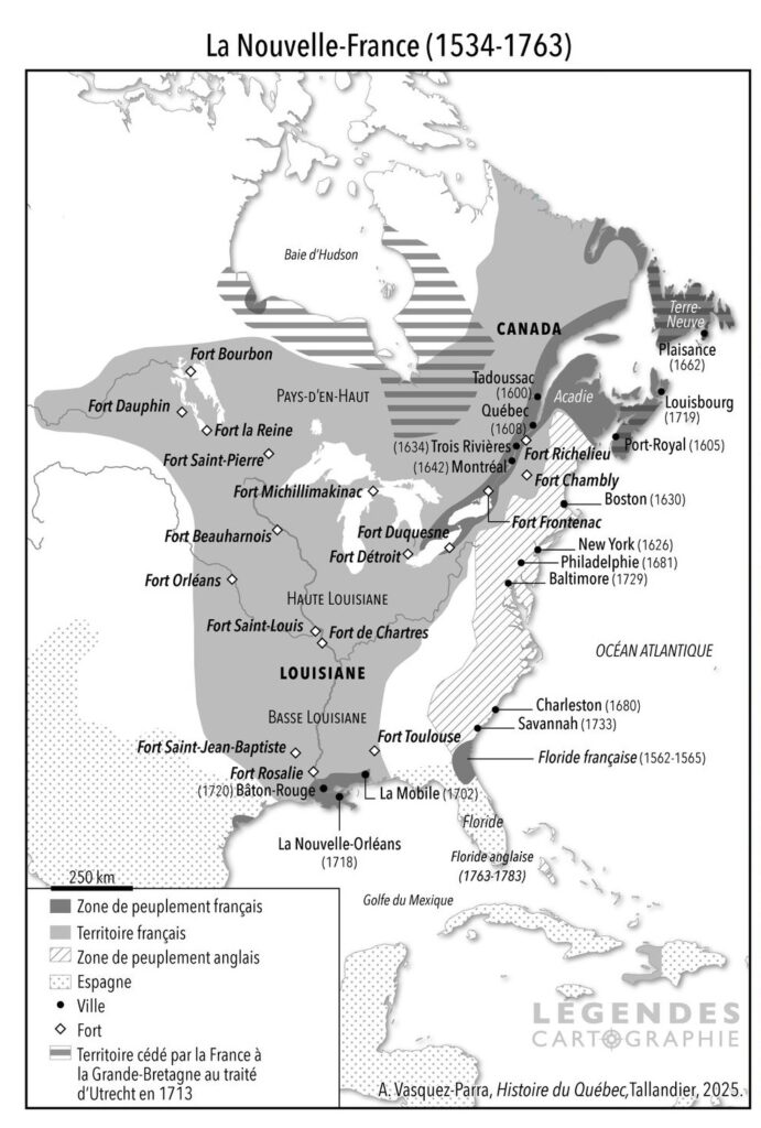 En 1608,Champlain fonde la ville de Québec et en fait la capitale de la Nouvelle-France, le nom qu’on donne alors à l’ensemble des colonies françaises d’Amérique du nord : le Canada, les îles de Saint-Pierre et Miquelon au large de Terre-Neuve (où des pêcheurs basques, bretons et normands pratiquent la chasse baleinière) et l’immense Louisiane, qui s’étend des Grands lacs jusqu’au golfe du Mexique, le long du Mississippi.