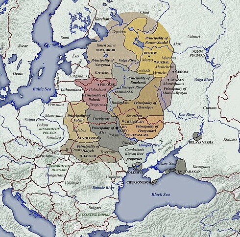 En 862, un de leurs chefs, Riourik, fonde Novgorod, au sud du lac Ladoga, tandis que deux de ses lieutenants chassent les Khazars de Kiev, une ville fondée par des Slaves, entre les VIe et VIIe siècles, sur le cours supérieur du Dniepr. Vingt ans plus tard, le successeur de Riourik, Oleg fusionne les établissements slaves et rus du nord et du sud au sein de la « R(o)us de Kiev » . Il s’agit d’une fédération très décentralisée dont Kiev est certes le centre, mais dont les membres sont largement indépendants, les différents princes rendant eux-mêmes des comptes à leur noblesse (les boyards), voire à des assemblées de citoyens, les vétché. Peu nombreux, les guerriers Varègues se fondent dans la population slave. Quelques États échappent à cette mouvance, telle la principauté de Polotsk : fondée au IXe siècle par des Slaves dans l’est de la future Biélorussie[2], elle soumet progressivement ses voisins immédiats, dont le prince de Minsk.